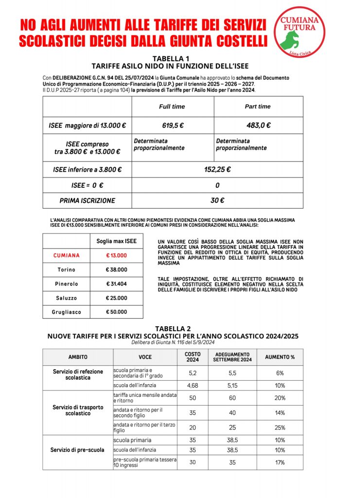 PER QUESTA RAGIONE I CONSIGLIERI DI CUMIANA FUTURA HANNO PRESENTATO NEL CONSIGLIO COMUNALE DEL 30 SETTEMBRE DUE MOZIONI, SULL’ASILO NIDO E SUI SERVIZI SCOLASTICI, A DIFESA DI DIRITTI CHE CONSIDERIAMO FONDAMENTALI E NON DEROGABILI.